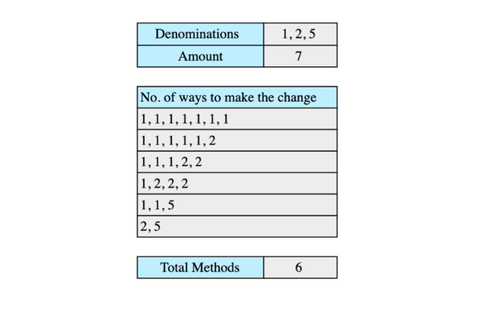 Suppose we have coin denominations of [1, 2, 5] and the total amount is 7. We can make changes in the following 6 ways: